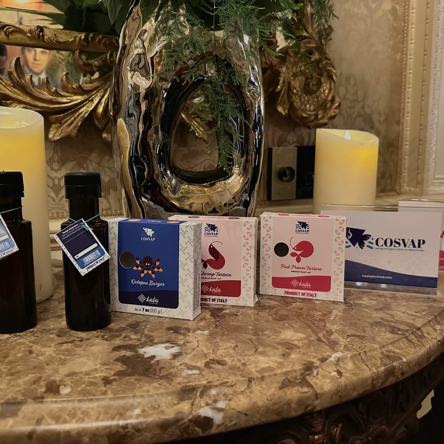 The evening took shape as a story built through food. Among the proposals, tartare of red scampi and shrimp, smoked swordfish, salmon marinated with citrus fruits and a selection of preparations that combined contemporary elements and references to regional cuisine. The fish, coming directly from Sicily, was the starting point of every taste.